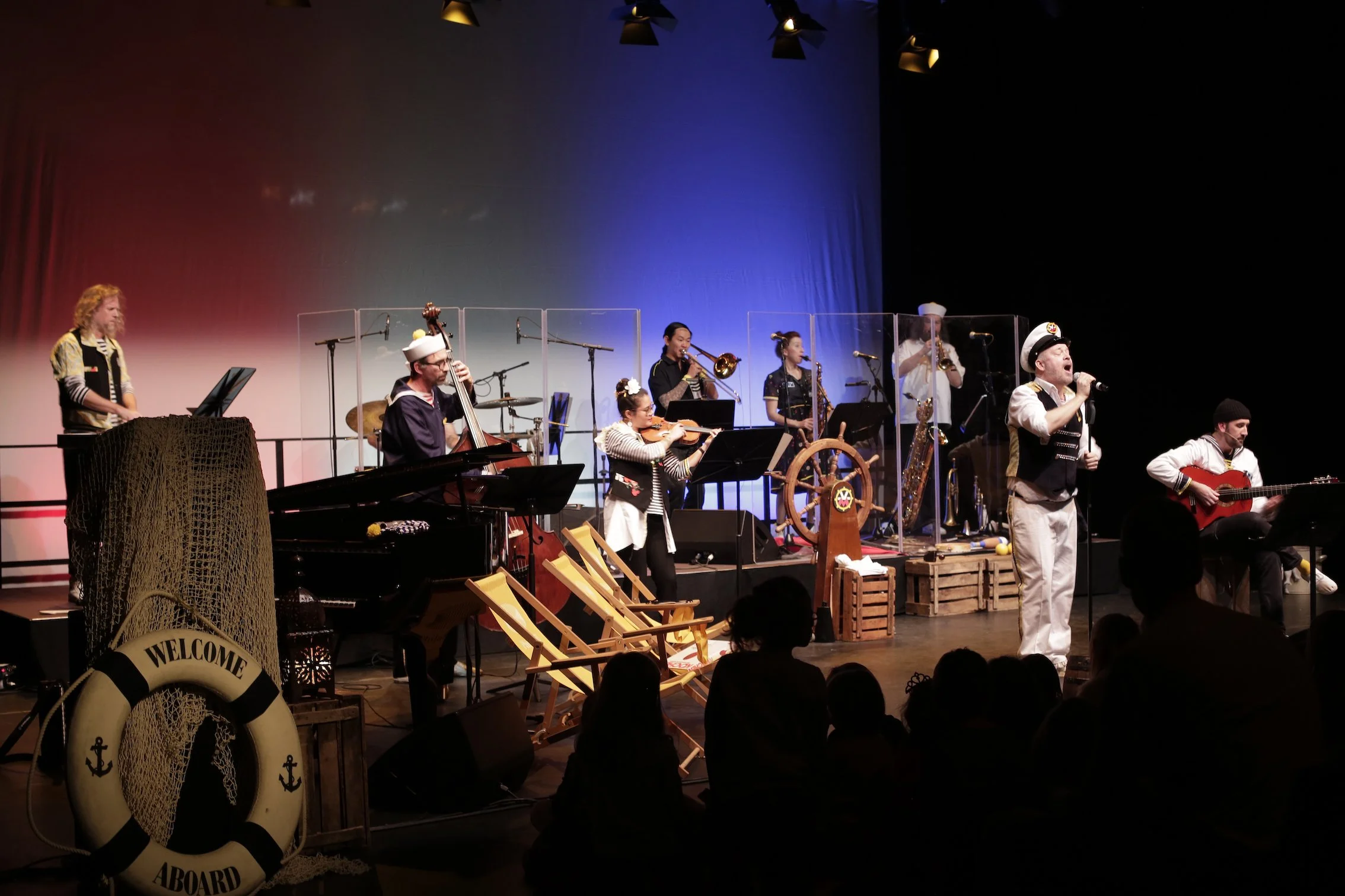 De Kapitän a seng Matrousen invitéieren all kleng a grouss Pirate fir mat hinnen ze sangen, ze danzen an ze schneeken.